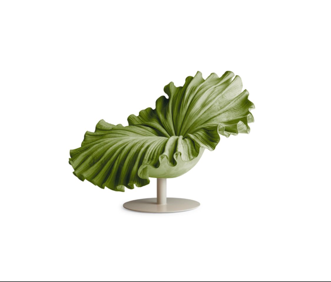 DESCRIPTION: The Bloom is handmade of microfiber stitched over a resin top with a steel base. Inspired by the graceful blossom of a flower, this lounge chair is sculpted by hundreds of fine running stitches radiating from the center of the seat creating a subtle textural feel.