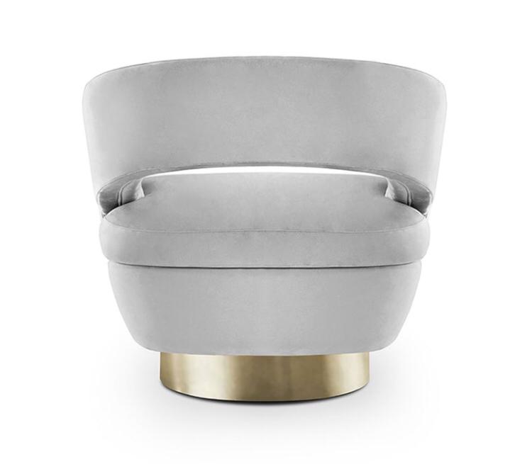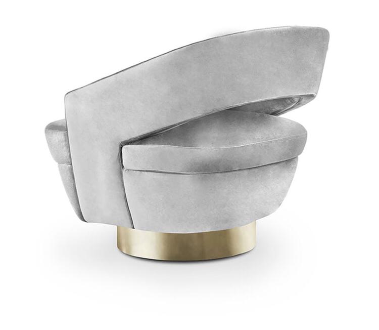 DESCRIPTION: This image features a stylish, modern swivel armchair. The chair is upholstered in a light grey or silver fabric, likely velvet, giving it a soft and luxurious appearance. It has a distinctive design with a rounded back and integrated arms that curve gracefully. The most striking feature is its polished gold or brass circular base, which adds a touch of elegance and allows the chair to swivel. The chair is placed on a textured floor, possibly concrete or a natural stone, against a similarly textured grey wall, creating a chic, minimalist, and contemporary aesthetic