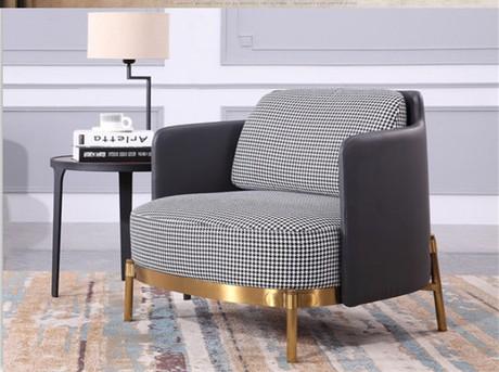 DESCRIPTION: The chair showcases a striking combination of patterns and materials. Its main body, including the outer arms and back, appears to be upholstered in a solid dark gray or black fabric or leather. This is elegantly contrasted by the seat cushion and inner backrest, which are covered in a classic black and white houndstooth pattern. The chair is elevated by a sleek, golden or brass-toned metal base that wraps around the bottom, supported by matching slender legs. The design suggests a blend of modern elegance with a touch of classic sophistication, making it a distinctive accent piece for a contemporary interior.