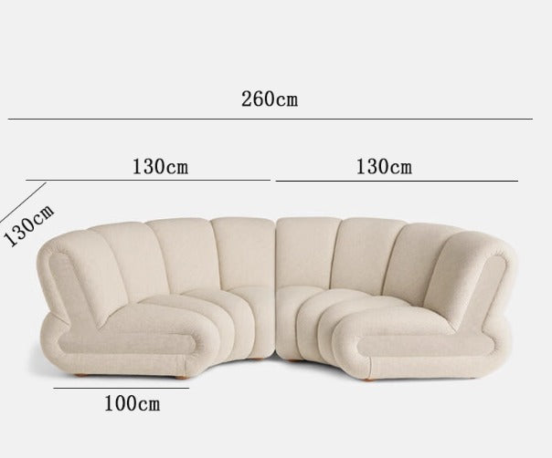 DESCRIPTION: This is an exceptionally luxurious and inviting curved sectional sofa, distinguished by its unique channeled upholstery and integrated elements. The Ingrid Curve Sofa is a grand and sculptural centerpiece, perfect for a spacious, modern living room, offering both opulent comfort and sophisticated functionality.