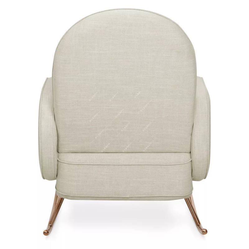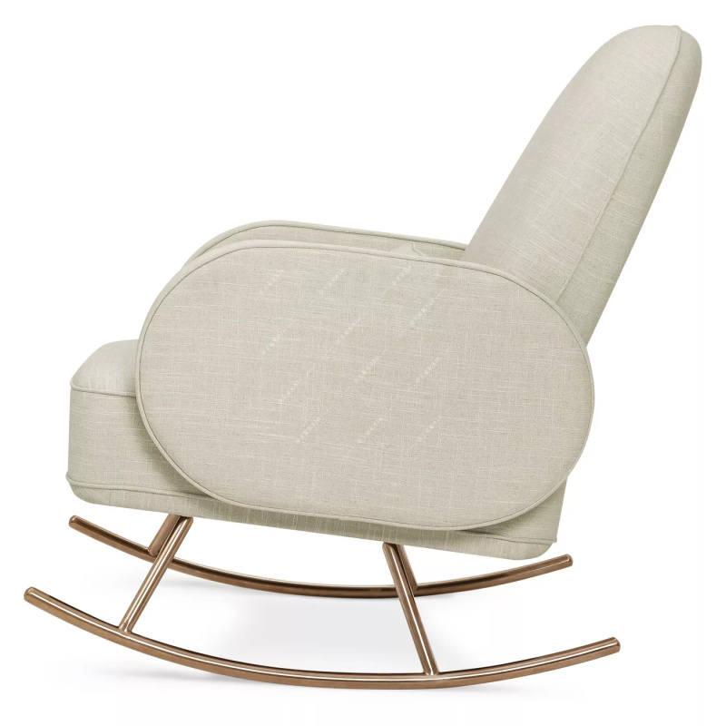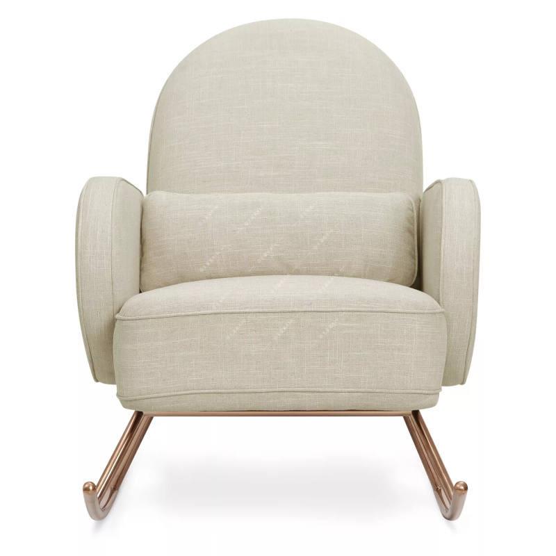 DESCRIPTION: This chair features a clean and inviting design, upholstered in a light, neutral-toned fabric, possibly a beige or off-white linen or textured weave. The chair has a tall, rounded backrest and rounded armrests, suggesting a cozy and supportive feel. A small lumbar pillow is nestled against the back for added comfort. The chair is set upon a sleek, rose gold or copper-toned metal frame that forms the rocking mechanism, contrasting beautifully with the light upholstery and adding a touch of modern elegance. This piece would be well-suited for a nursery, reading nook, or a contemporary living space.