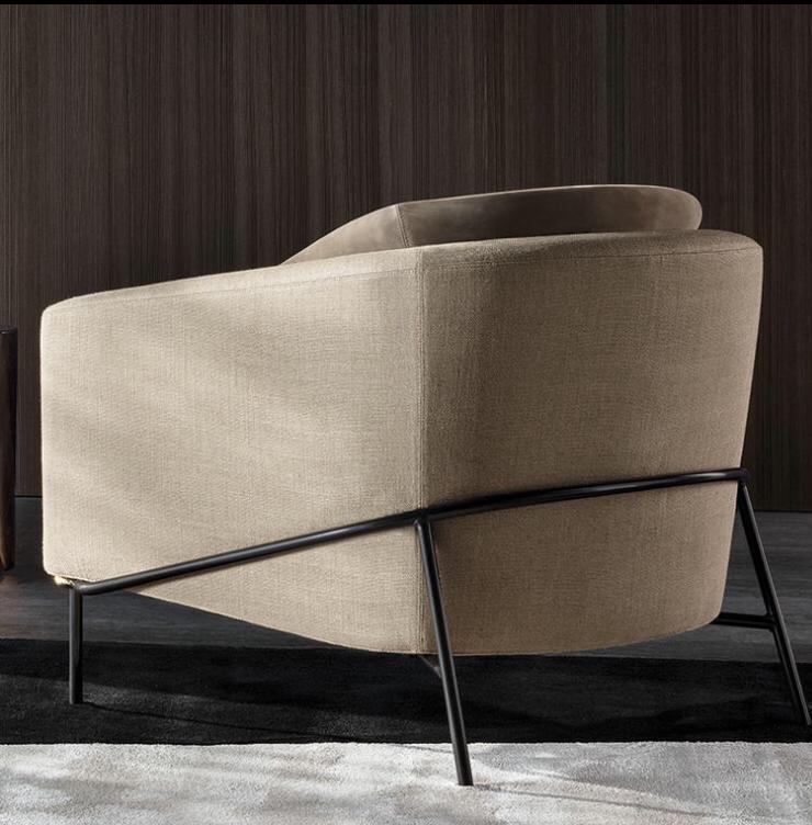 DESCRIPTION: This chair displays a chic and contemporary armchair, set within a sophisticated interior. The chair features a striking contrast in upholstery, with the outer frame in a light, textured fabric (possibly linen or a subtle weave) and the inner seat and backrest in a darker, smooth fabric, likely a dark beige or taupe. The armchair is supported by a slender, black metal frame that extends to form the legs, subtly accented with gold-toned caps where it connects to the chair's base, adding a touch of elegance. The overall design is sleek and inviting.