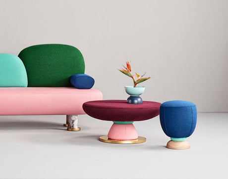 DESCRIPTION: This image features a highly distinctive and playful, post-modern seating piece, It showcases a delightful medley of shapes, colors, and textures. The main body of the seating is a substantial, elongated pink upholstered base with soft, rounded edges. Resting on this base are three backrest elements: a prominent, rounded rectangle in a deep forest green, a smaller, dome-shaped cushion in a bright teal, and a tiny, oval armrest in a vibrant royal blue. The overall impression is one of whimsical creativity and bold design, ideal for a contemporary and unconventional interior.