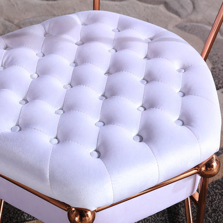 DESCRIPTION: This image features a highly decorative and elegant "Vicky Chair," set against a backdrop of a light blue wall and a patterned rug. The chair's frame is constructed from slender, polished rose gold-toned metal, featuring spherical accents at various joints, giving it a luxurious and somewhat whimsical feel. The seat and two separate, cylindrical backrest cushions are upholstered in a pristine white, tufted velvet, adding to its opulent appearance. The backrest cushions are positioned on either side, providing a unique and open back design. This piece would function beautifully as a vanity chair or a chic accent chair in a sophisticated interior.
